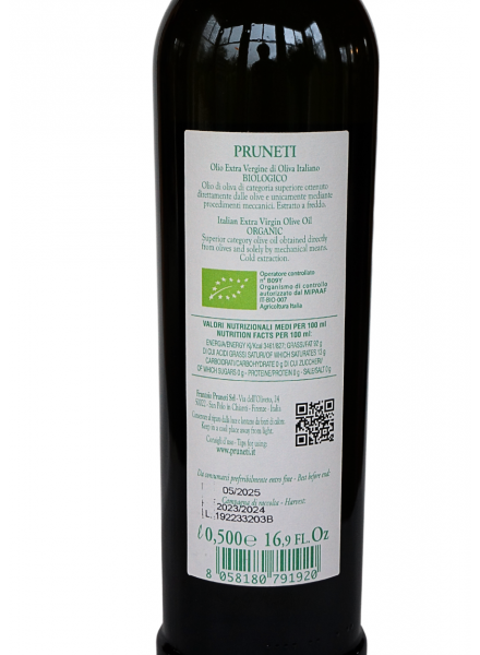 Hersteller: Die Azienda Pruneti wird von den Brüdern Gionni und Paolo Pruneti in vierter Generation geführt. Der Name Pruneti ist mittlerweile zum Synonym für höchste Qualität geworden. Auf heute 85 Hektar werden verschiedene Olivensorten kultiviert. Die wichtigsten sind Frantoio, Moraiolo, Correggiolo, Pendolino und Leccino kultiviert. In die hochmoderne Ölpresse auf der Azienda gelangen nur die eigenen Oliven. In 2022 wurde die Mühle komplette überarbeitet, und verfügt heute über eine durchgehende Kühlung, so dass jeder Produktionsschritt bei niedrigen Temperaturen vorgenommen werden kann. Das macht in Zeiten des Klimawandels, in denen die Oliven bei der Ernte durchaus noch zu warm sein können, zu einem wichtigen Teil der Qualitätsphilosophie. Die Azienda zählt stabil zu den TOP 20 der Welt.