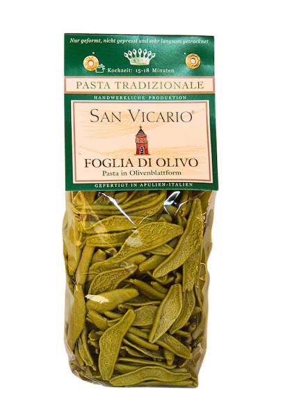 Pasta in der Form eines Olivenblattes. Grün gefärbt mit Spinatpulver. Eine handwerklich, traditionell hergestellte Pasta. Sie wird nur geformt, aber nicht gepresst. Es wirken kein Druck und keine hohe Temperatur auf den Teig ein. Bester Hartweizen und Quellwasser sind die einzigen Zutaten. Aufgrund der guten Rohwarenqualität aus dem regionalen Hartweizenanbau rund um Fasano in Apulien hat die Pasta einen angenehm frischen Eigengeschmack und harmoniert besonders gut mit Tomatensaucen oder als Basis für einen italienischen Nudelsalat (crudaiola).