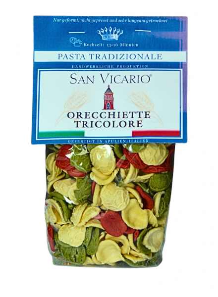 Eine handwerklich, traditionell hergestellte Pasta in klassischer, apulischer Form der Orecchiette ("Öhrchennudel"). Allerdings: Die Pasta präsentiert sich dreifarbig, in den klassischen, italienischen Farben der TRICOLORE: rot, weiß und grün. Gefärbt werden die Orecchiette tricolore mit Spinatpulver (grün), Rote-Bete- und Tomatenpulver (rot). Natürlich aus Bioanbau!
