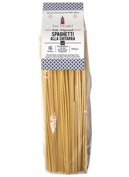 San Vicario "Spaghetti alla chitarra" sind eine echte Spezialität aus den Abruzzen. Es sind traditionelle, quadratische Spaghetti, mit 2,2 mm Durchmesser besonders dick. Sie werden aus hochwertigem Bio-Hartweizengrieß mit der Bronzeform hergestellt und trocknen bei rund 40 °C für ca. 50 Stunden. Da sie deutlich dicker sind, als normale Spaghetti, zeigen sie einen schönen, vollaromatischen Eigengeschmack in jedem Pastagericht. Durch ihre rauhe Oberfläche (Bronzeform) haftet die Sauce wunderbar an, ein wirklicher Genuss!.