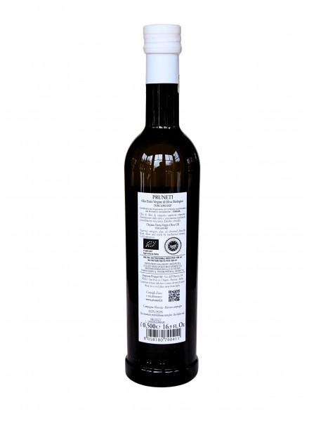 Besonderheit: Ausschließlich aus eigenen Oliven des Familienbetriebes PRUNETI hergestellt in der eigenen Ölmühle unter Sauerstoffausschluss. Im Jahr 2017, 2018 und 2020 wurde dieses Olivenöl vom Olivenölguide FLOS OLEI mit 98 von 100 Punkten bewertet. In 2020: MERUM: 5 Tropfen Top Score